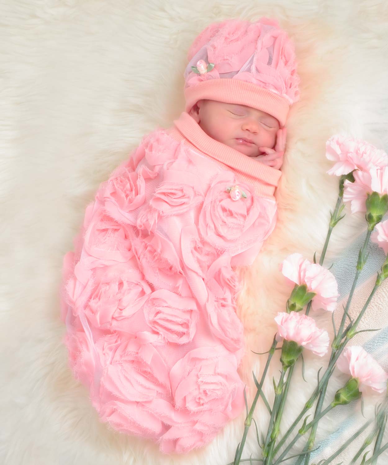 Soft colors swirl gently around this charming Cozy Cocoon! Light pink chiffon lace is lined with our comfy cotton stretch to embrace baby in elegant swaddling comfort. Little one remains totally cozy while looking totally fabulous. Wide cotton stretch rib collar for easy on, easy off.